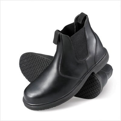 7141 - Black - 9 - Wide Size: 9 7141 Slip-Resistant Twin Gore Work Boots by Genuine Grip Features: -Men's 7141 Slip-Resistant Twin Gore Work Boots in Black. -Part of the Slip-Resistant Twin Gore collection. -Quality leather upper. -Slip-resistant rubber outsole with superior grip. -Shock absorbing polyurethane mid-sole. -Flexible soft insole board. -Oil and water resistant. -6'' slip-on light weight boots. -Available in Black (7141).